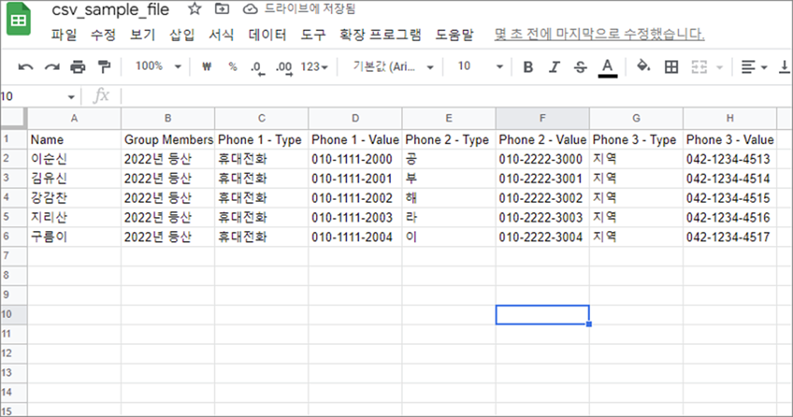 ▼ 그림처럼 스프레드시트에 CSV 파일의 데이터는 분리해서 셀에 들어갑니다. 이후 불러온 데이터를 편집합니다.