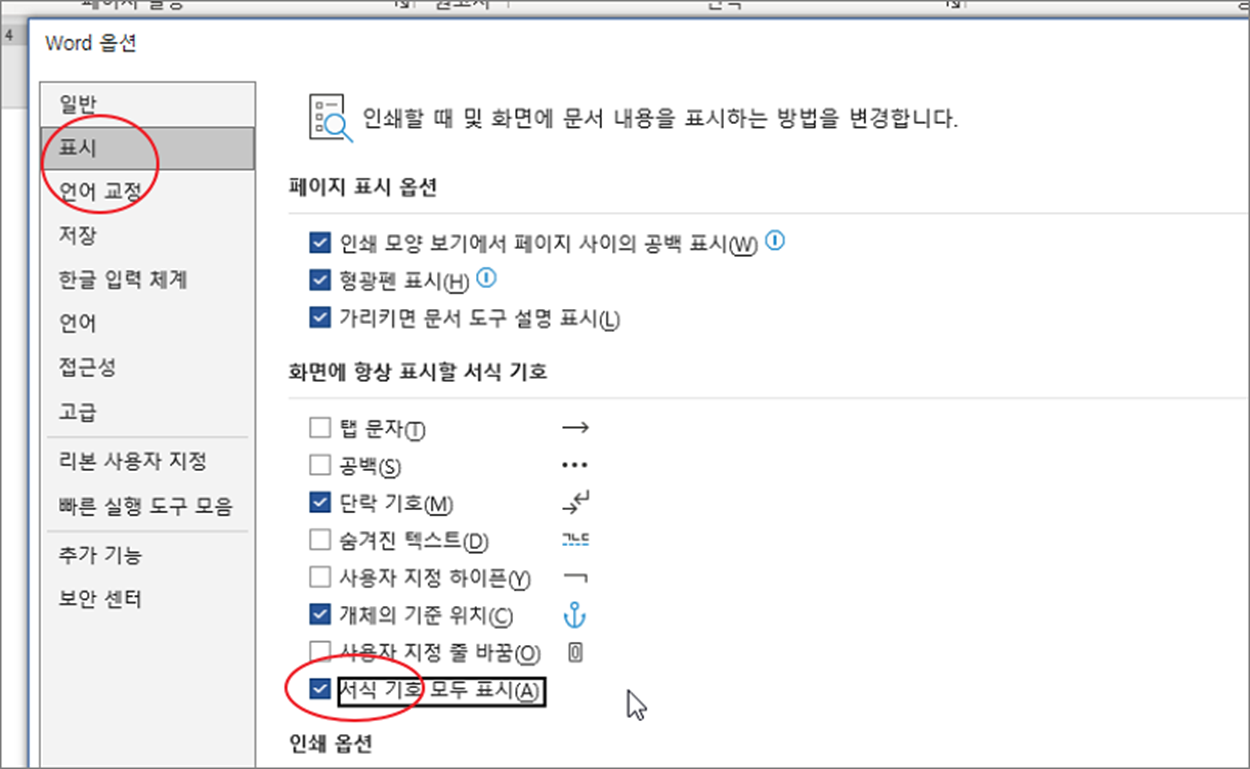 ▼ 워드 옵션 창이 뜨면 왼쪽 사이드에서 표시 메뉴를 선택합니다. 오른쪽 옵션 목록에서 “화면에 항상 표시할 서식 기호” 항목으로 가시면 서식 기호 모두 표시 가 있을 겁니다. 페이지 나누기와 구역 나누기는 별도의 옵션으로 제공하지 않기 때문에 “서식 기호 모두 표시” 를 체크해야 볼 수 있습니다.