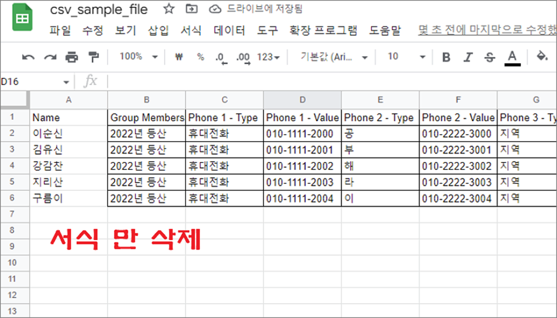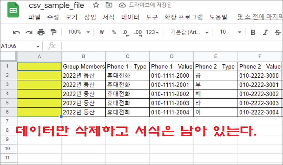 ▼ 그림처럼 서식은 그대로 남아 있고 데이터만 삭제가 되었습니다. 다음은 서식 지우는 방법을 알아보겠습니다.