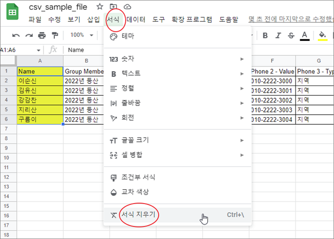 ▼ 아쉽게도 데이터와 서식을 함께 지우는 방법은 없습니다. 서식과 데이터를 모두 삭제하기 위해서는 셀 자체를 삭제하거나 서식과 데이터를 차례대로 삭제해야 합니다. 서식은 서식 > 서식 지우기 메뉴를 이용해서 지웁니다.