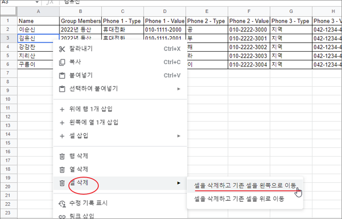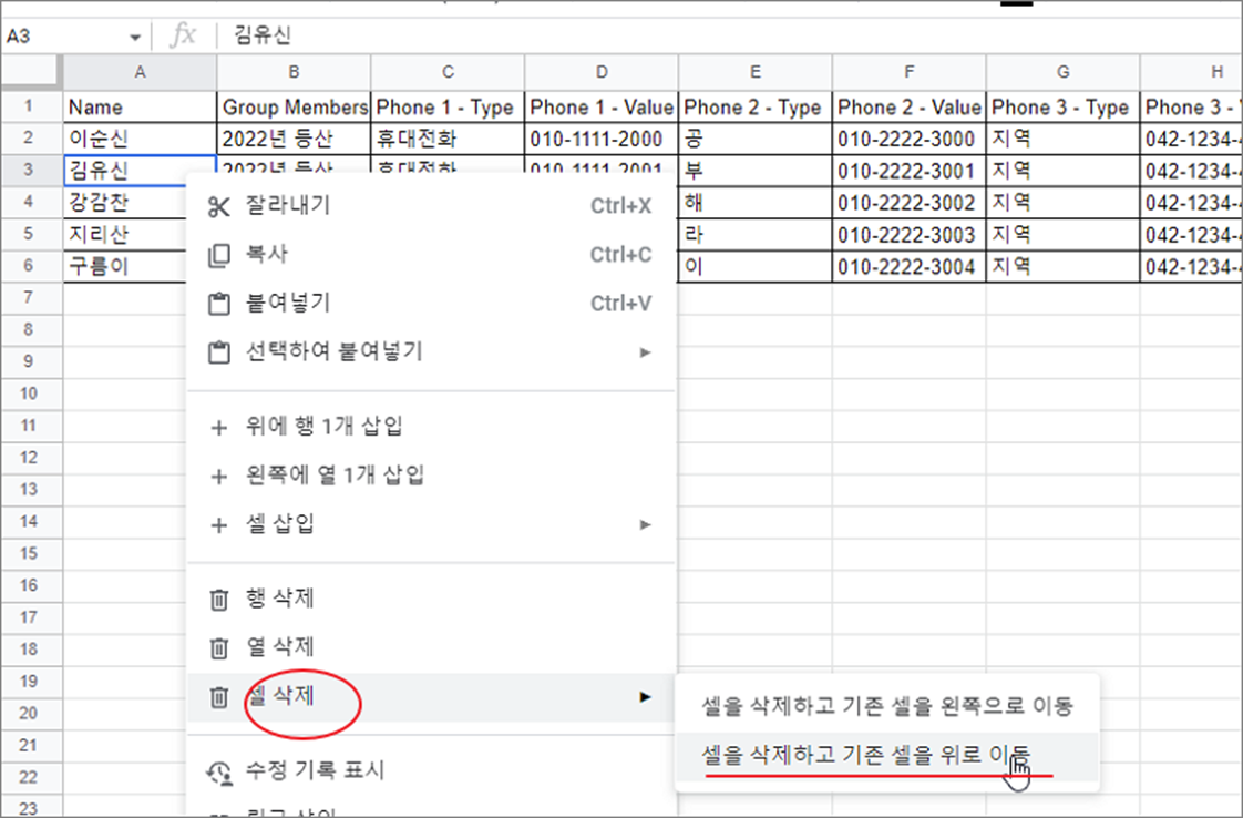 ▼ 마지막으로 셀 자체를 삭제해 보겠습니다. 셀은 삭제 이후에 주변 셀들을 이동해서 자동으로 채워야 합니다. 이 때 셀의 위치에 따라서 양옆 또는 위아래 중 하나를 선택해야 합니다. 단일 혹은 영역을 선택하고 오른쪽 마우스 > 셀 삭제 메뉴로 선택해 보세요. 하위에는 어떤 방향의 기존 셀을 이동할 것인지 메뉴가 나옵니다.