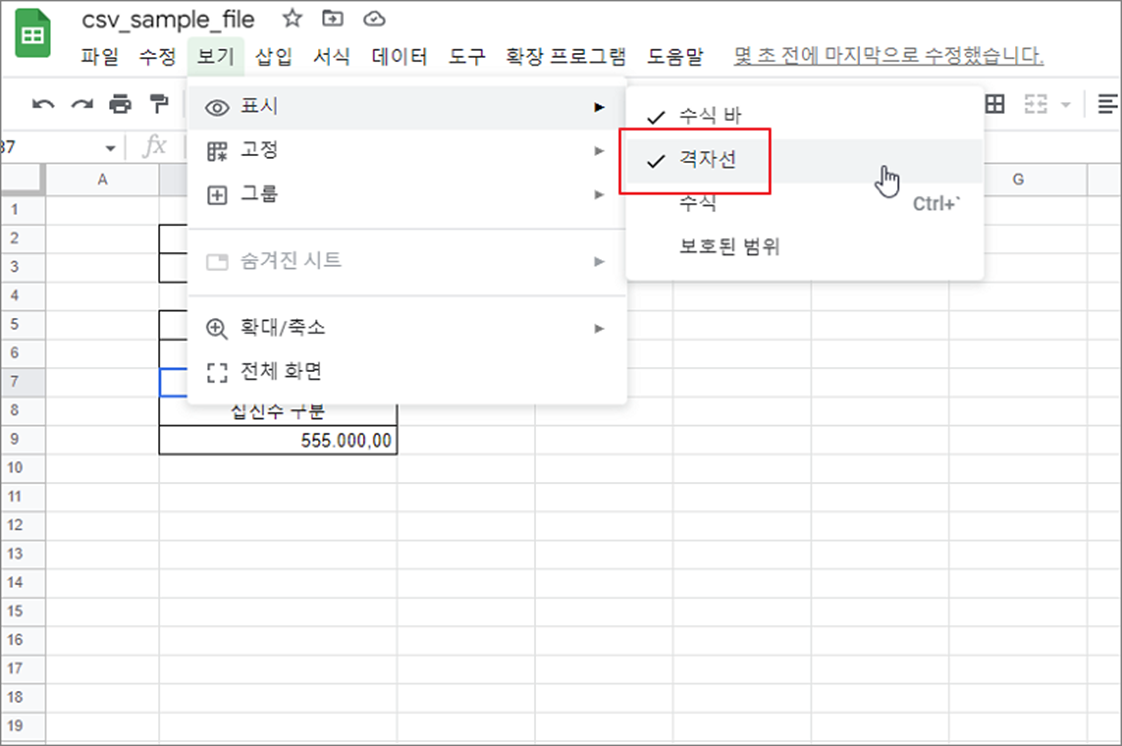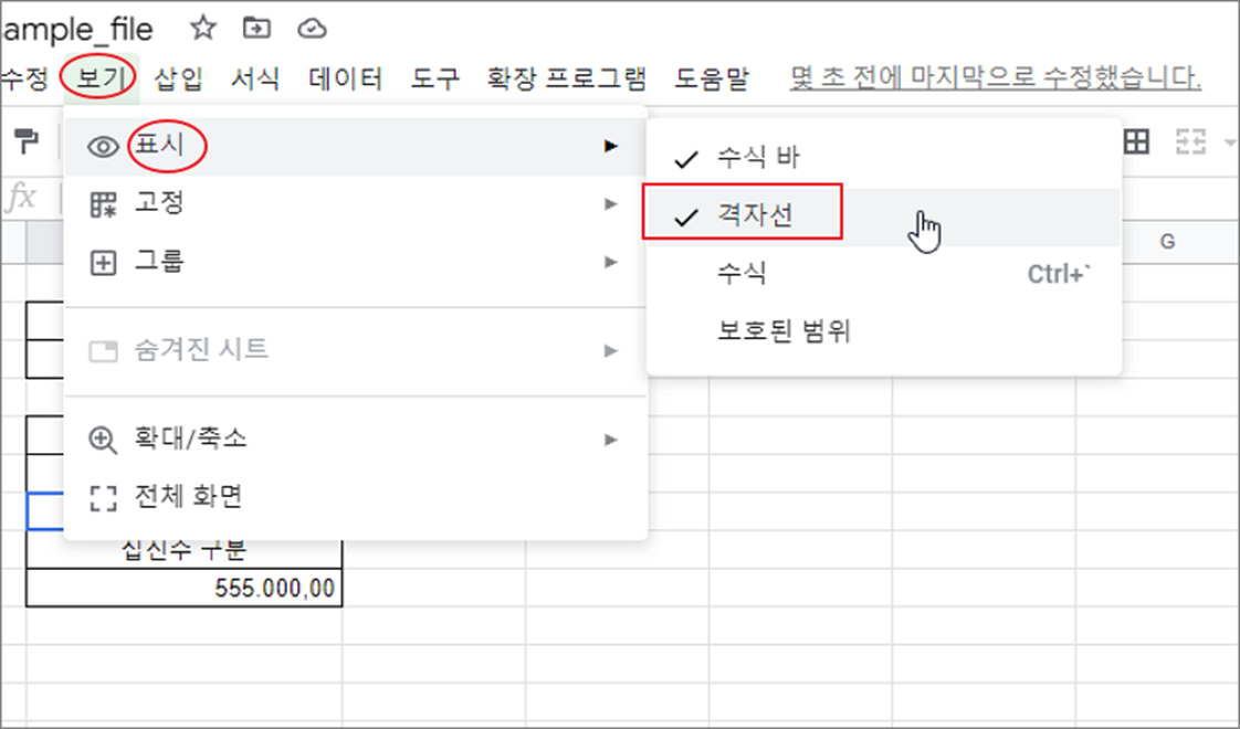 ▼ 회색 격자선을 숨기기 위한 방법은 간단합니다. 상단 보기 > 표시 > 격자선 메뉴를 통해 셀 간 선을 표시할 것인지 아니면 숨길 것인지 결정할 수 있습니다. 메뉴를 클릭해서 체크 표시를 해제하면 라인이 사라집니다.