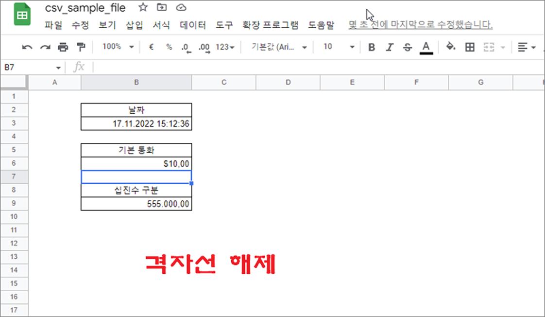 기본적으로 시트에 셀 간 격자선은 회색으로 표시합니다. 이런 격자선은 상황에 따라 제거하기도 합니다. 이유는 스프레드시트의 데이터를 더 읽기 쉽고 보기 편하게 만들기 위한 의도입니다. 다시 말해 가독성을 높이기 위한 작업입니다.