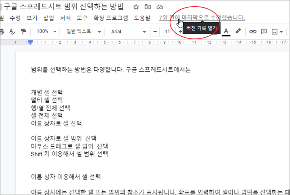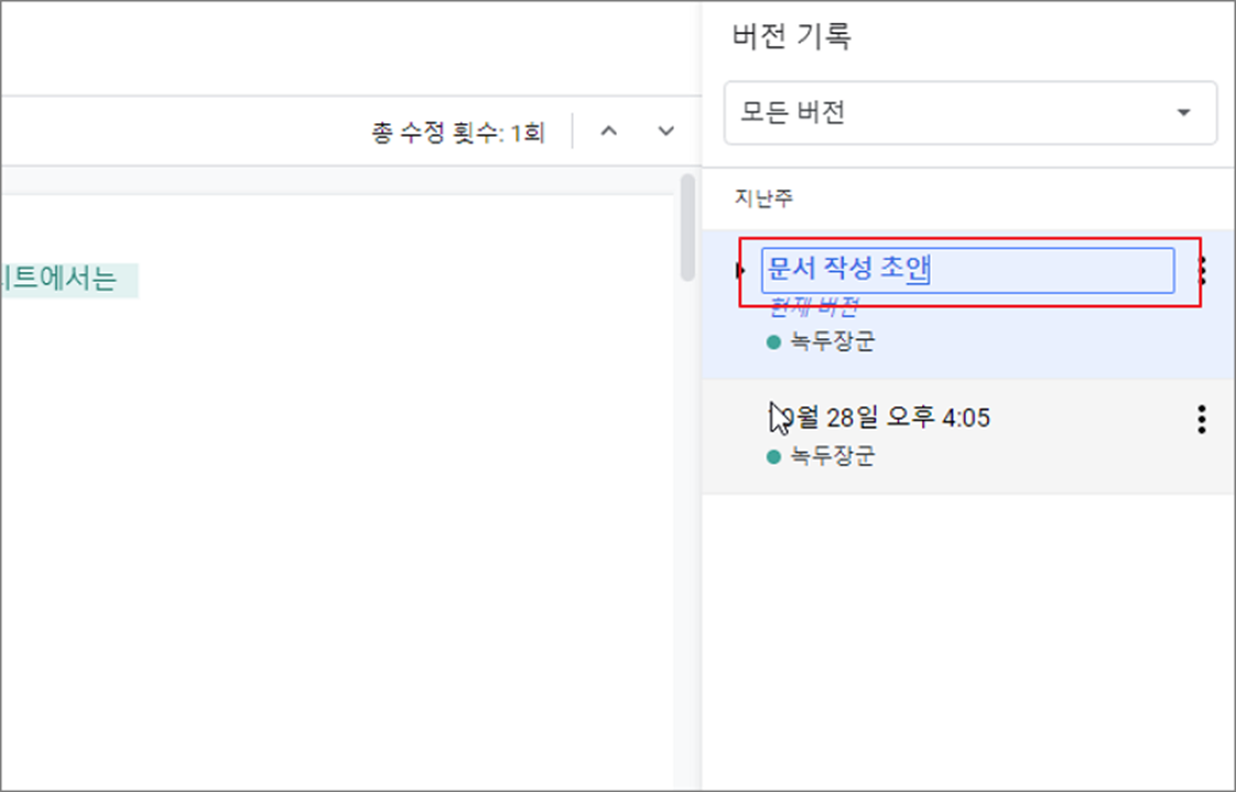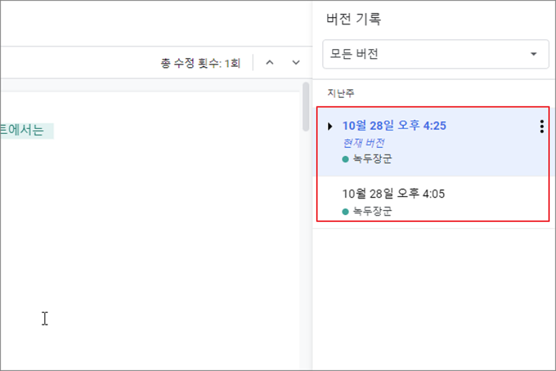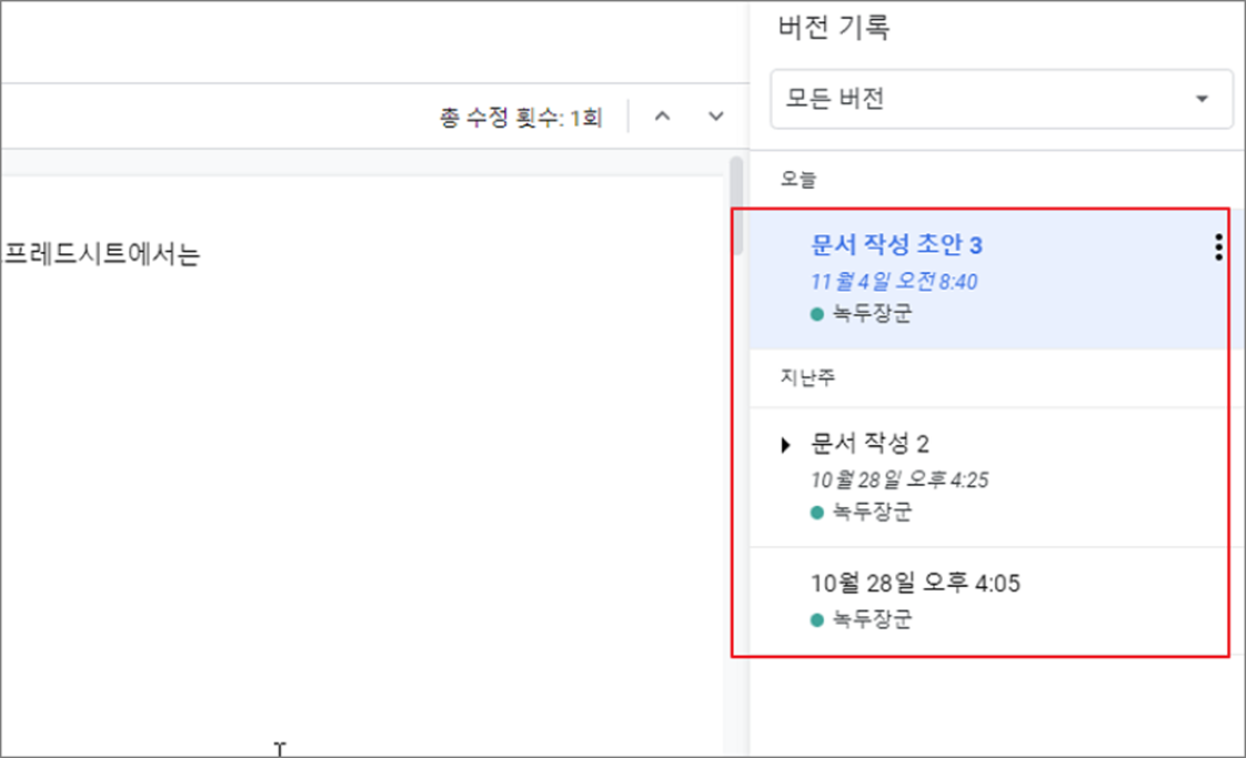 ▼ 오른쪽 사이드에 뜬 버전 기록 화면에는 지금까지 문서의 변경점을 최근 시간순으로 보여줍니다.