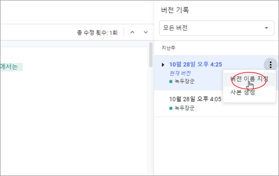 ▼ 저장된 버전 이력은 사용자가 원하는 이름으로 변경할 수 있습니다. 특정 시점에 중요한 변경점이 있다면 차후 복원이나 점검을 위해 핵심 내용을 타이틀로 만들어 두는 것도 좋습니다. 더보기 > 버전 이름 지정 메뉴를 클릭합니다.