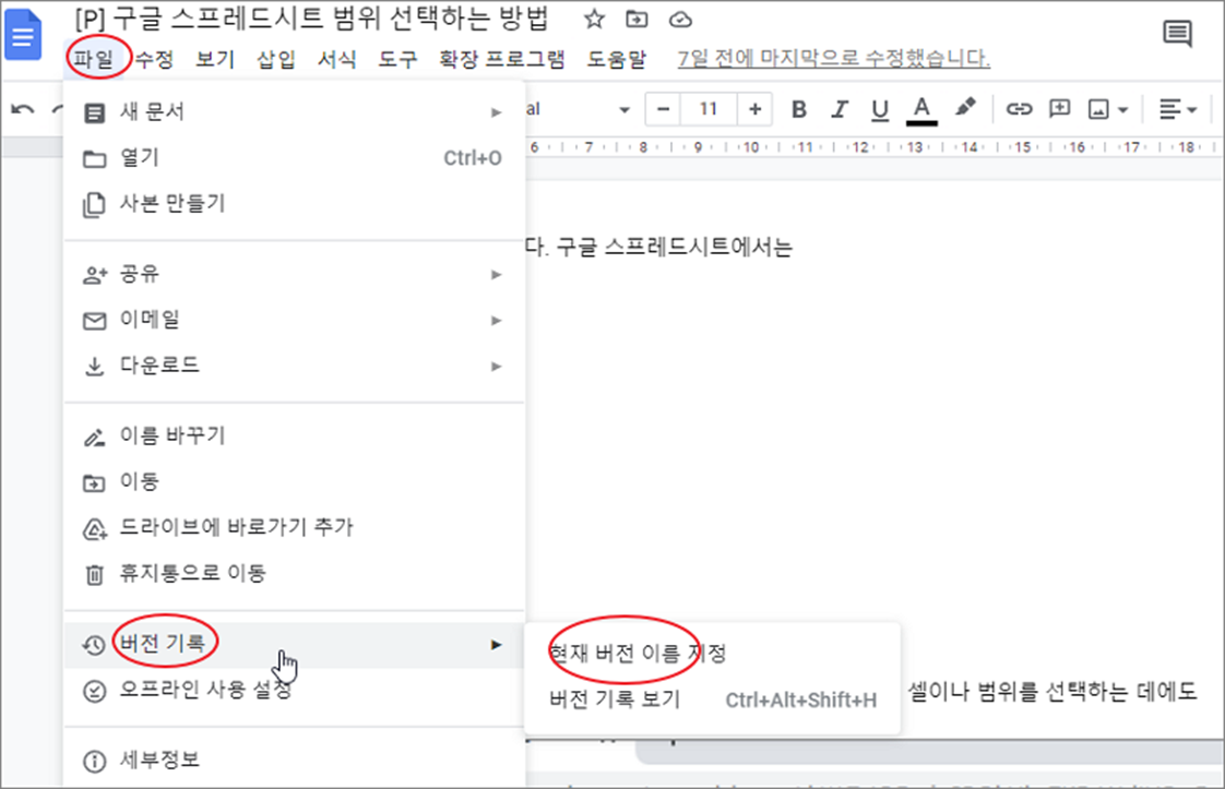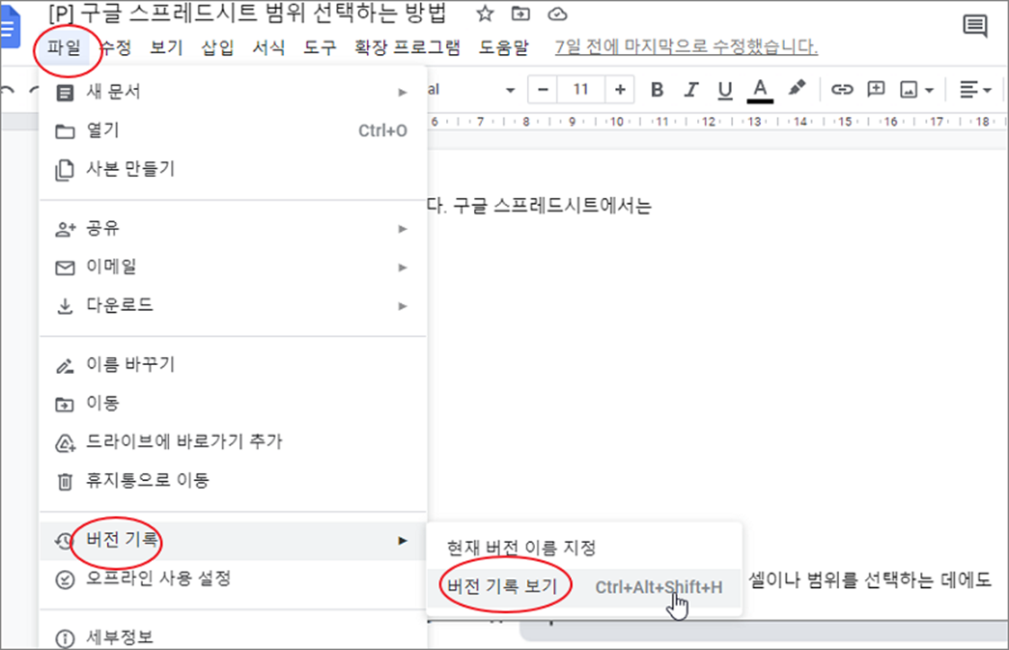 ▼ 상단 메뉴를 통해 버전 기록 창을 띄울 수도 있습니다. 파일 > 버전 기록 > 버전 기록 보기 메뉴를 클릭합니다.