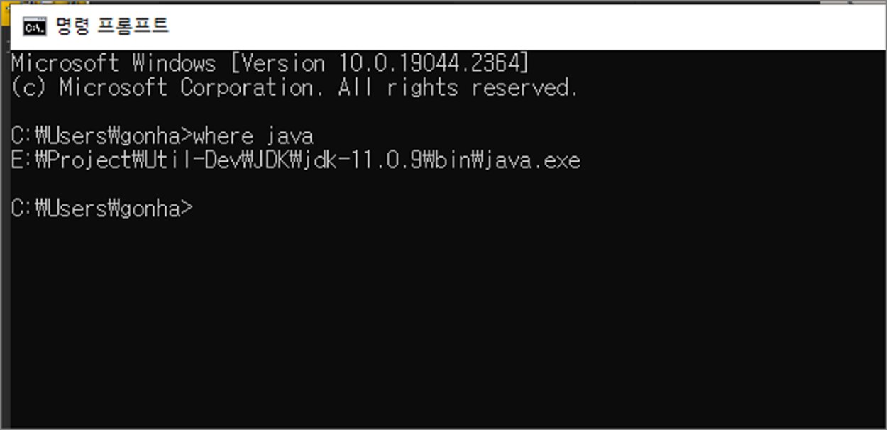 ▼ Windows에서 Java의 현재 위치를 가져 오는 데 가장 일반적으로 사용되는 명령은 where java 입니다. 참고로 Linux 운영 체제에서는 유사하지만 whereis 명령어를 사용합니다. 아래와 같이 Windows의 명령 줄에서where java명령을 실행하면 java.exe의 위치가 반환됩니다. JAVA_HOME 변수에 입력한 주소와 동일합니다.