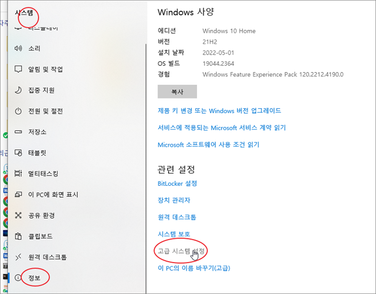 ▼ 먼저 윈도우 설정에서 JAVA_HOME 시스템 변수에 입력한 주소 위치를 확인해 보겠습니다. 이전에 사용자가 추가한 적이 없다면 JAVA_HOME 변수가 없을 수도 있습니다. 설정 > 시스템 > 정보 > 고급 시스템 설정 메뉴를 차례대로 찾아 실행합니다.