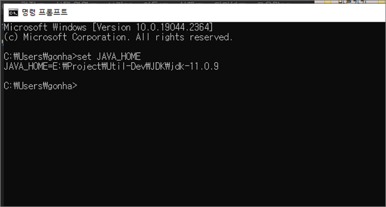 ▼ 다음 명령어는 set JAVA_HOME 입니다. Windows에서 Java 또는 JDK의 경로는 환경 변수에 저장됩니다. set 명령어가 PATH 에 추가한 환경 변수 값을 출력할 때 사용합니다. 사용자가 이전에 추가한 JAVA_HOME 환경변수가 없다면 나타나지 않습니다.