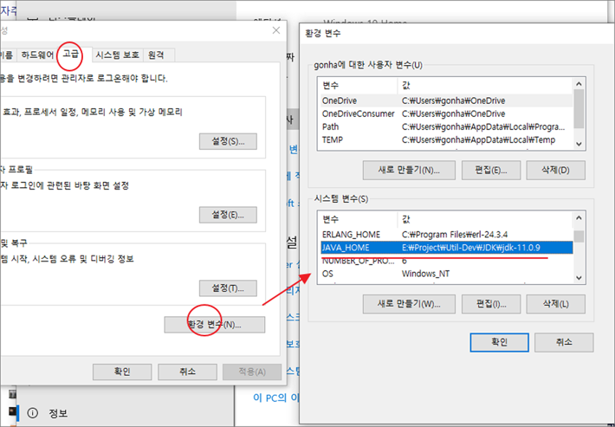 ▼ 시스템 설정 팝업창이 뜨면 고급 탭 > 환경 변수 버튼을 눌러 또 다른 팝업창을 띄웁니다. 시스템 변수 목록에서 JAVA_HOME 변수를 찾아 하드디스크 어디 위치에 설치가 되어 있는지 확인합니다.
