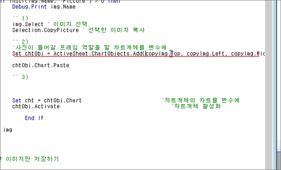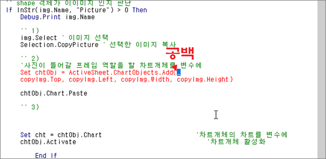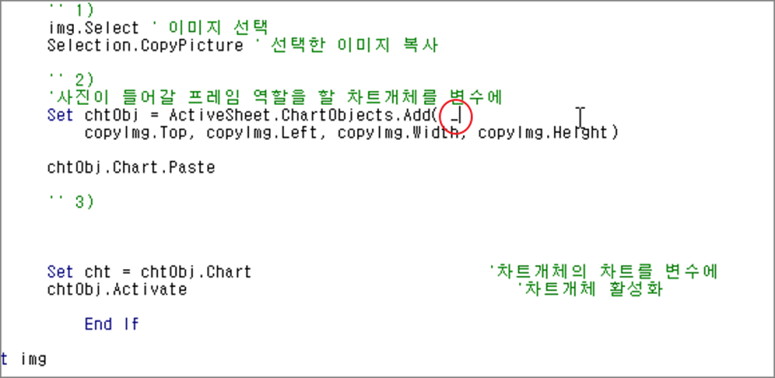 ▼ VBA 에서 긴 줄의 소스를 줄바꿈하기 위해서는 특수문자 언더바(_) 를 사용해야 합니다. 다른 개발언어와 달리 Enter 를 눌러 줄바꿈을 한다고 해서 적용되는 것은 아닙니다.