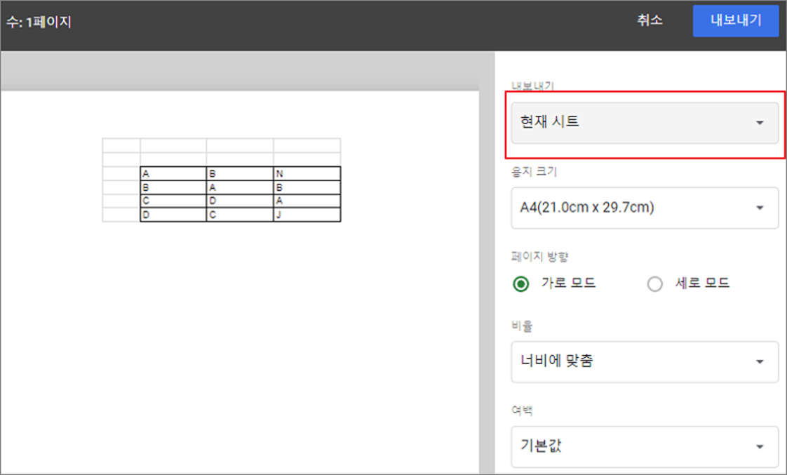 ▼ PDF 다운로드 페이지가 나타나면 기본 내보내기 옵션이 현재 시트로 선택되어 있을 겁니다.