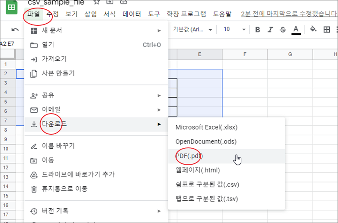▼ 다음 PDF 파일 변환을 위해 파일 > 다운로드 > PDF 메뉴를 선택합니다.