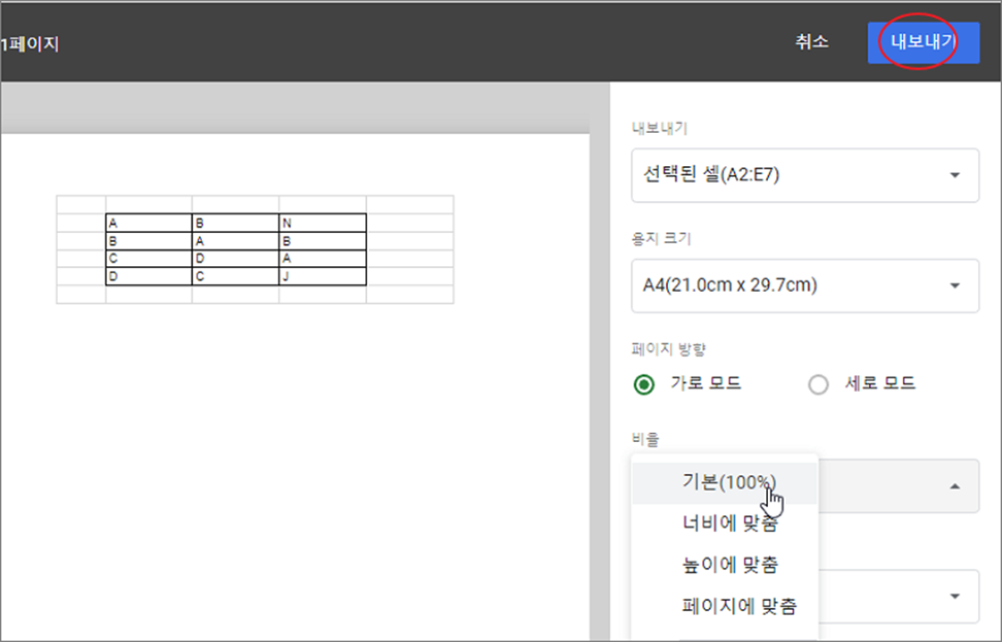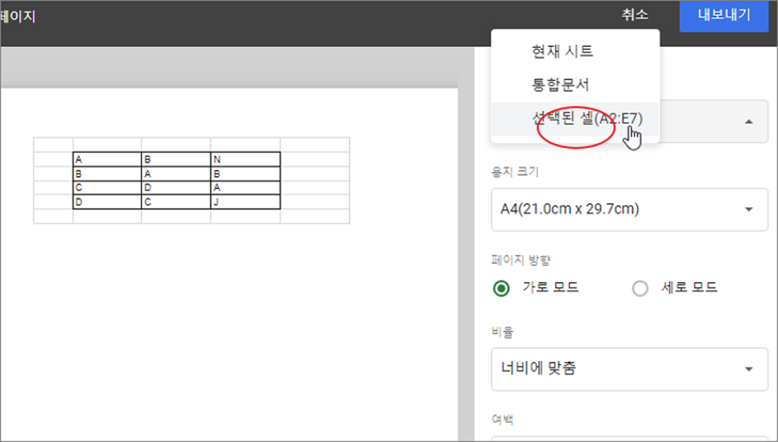 ▼ 오른쪽 미리보기 화면에는 출력할 셀이 나타납니다. 다음 아래에 출력 옵션을 선택하고 내보내기 버튼을 클릭합니다.