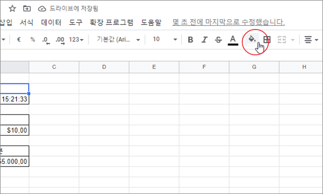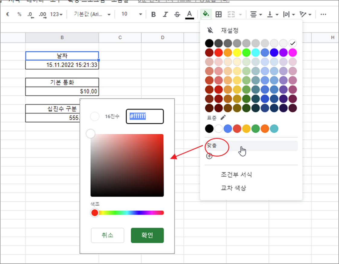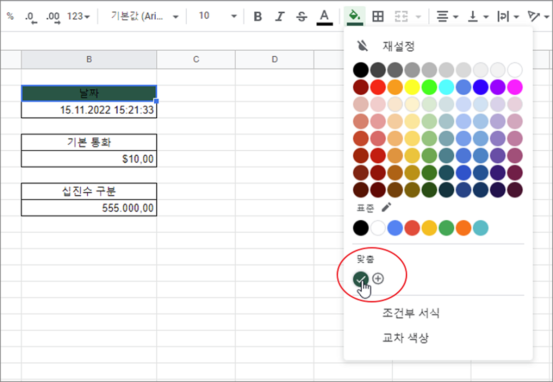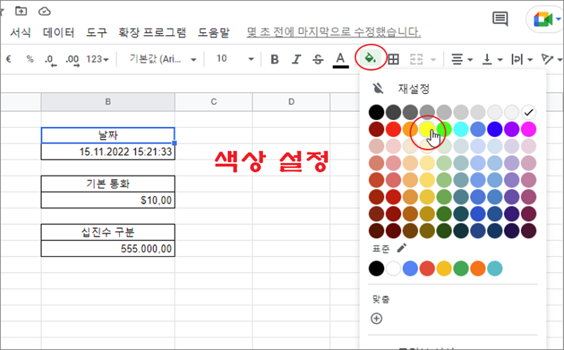 사용자는 스프레드시트의 셀 배경에 다양한 색상을 적용할 수 있습니다. 적용 대상은 사용자가 선택한 영역입니다. 하나의 셀 이거나 드래그해서 영역을 선택한 후 동일한 색상을 한 번에 적용하기도 합니다. 색상 팔레트에는 추천 색상 목록이 있으며, 사용자가 직접 RGB 값을 넣어 적용할 색상을 만들 수도 있습니다.