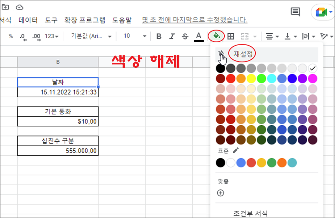 ▼ 셀에 적용한 색상을 해제하고 싶다면 채우기 색상 > 재설정 메뉴를 클릭합니다. 기본 색상인 하얀색으로 바뀝니다.
