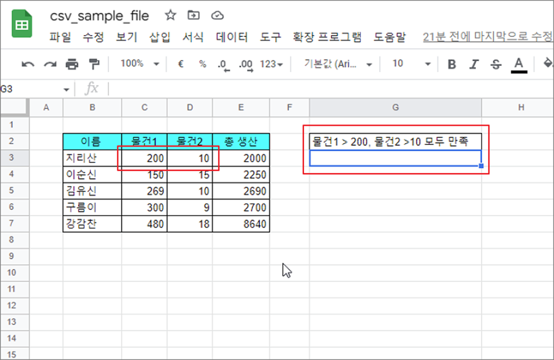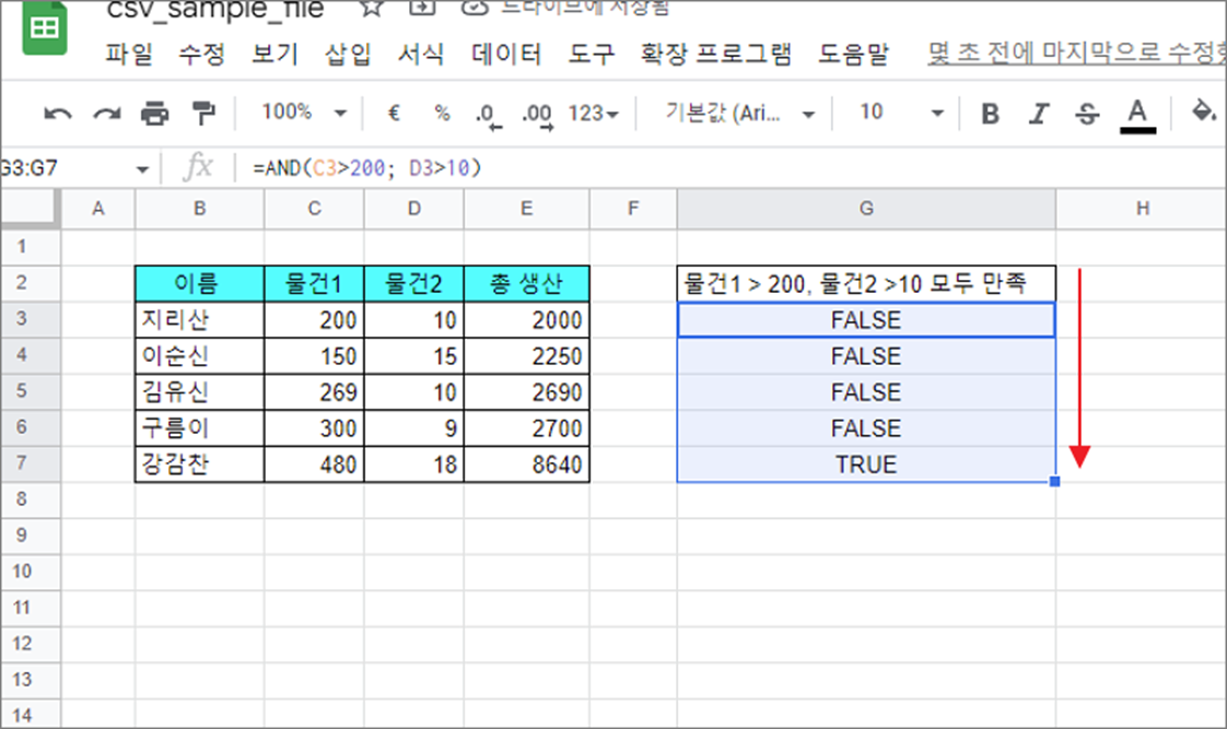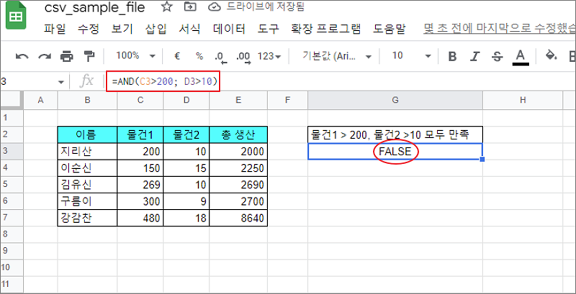 스프레드시트에서 AND 함수는 여러 조건을 만족하는지 여부를 판단할 때 사용합니다. 함수를 실행한 결과는 TRUE/FALSE 중 하나입니다. TRUE 는 AND 에 입력한 조건들을 모두 만족하는 것이고, 하나라도 조건이 틀리면 FALSE 입니다.