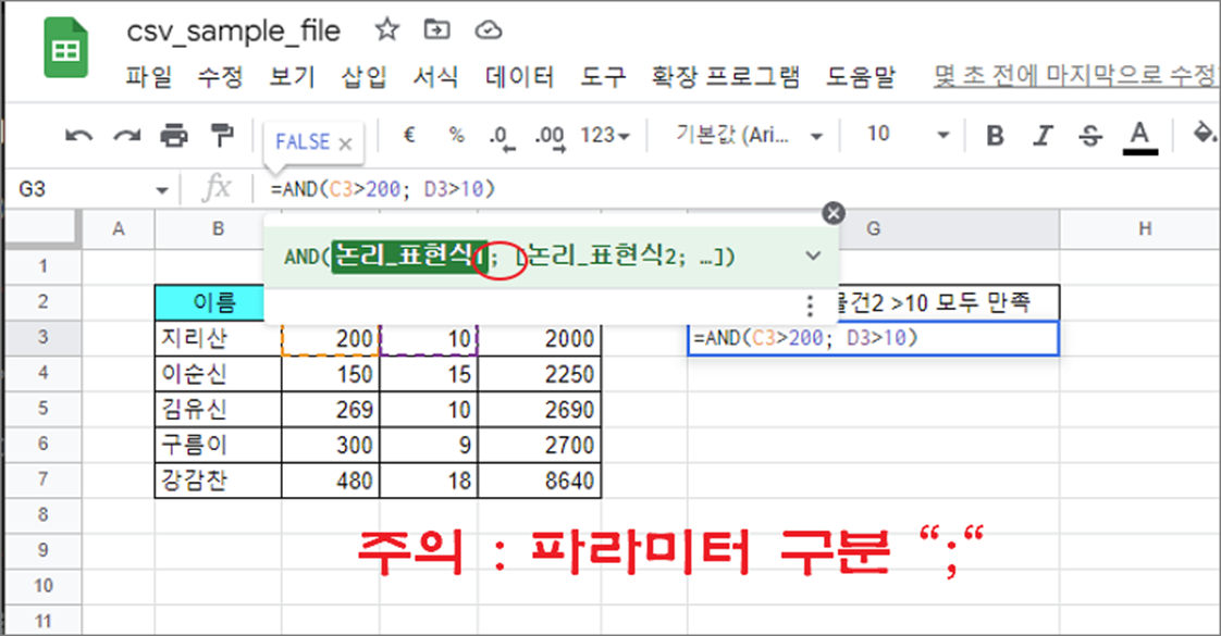▼ 스프레드시트에서 파라미터 값을 입력할 때 주의할 것이 있습니다. 엑셀과 달리 함수 파라미터를 구분할 때 쉼표(,) 가 아닌 세미콜론 (;) 을 사용합니다. 쉼표를 사용할 경우 파싱 오류가 발생합니다.