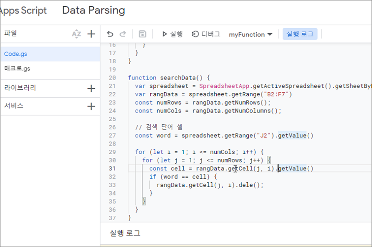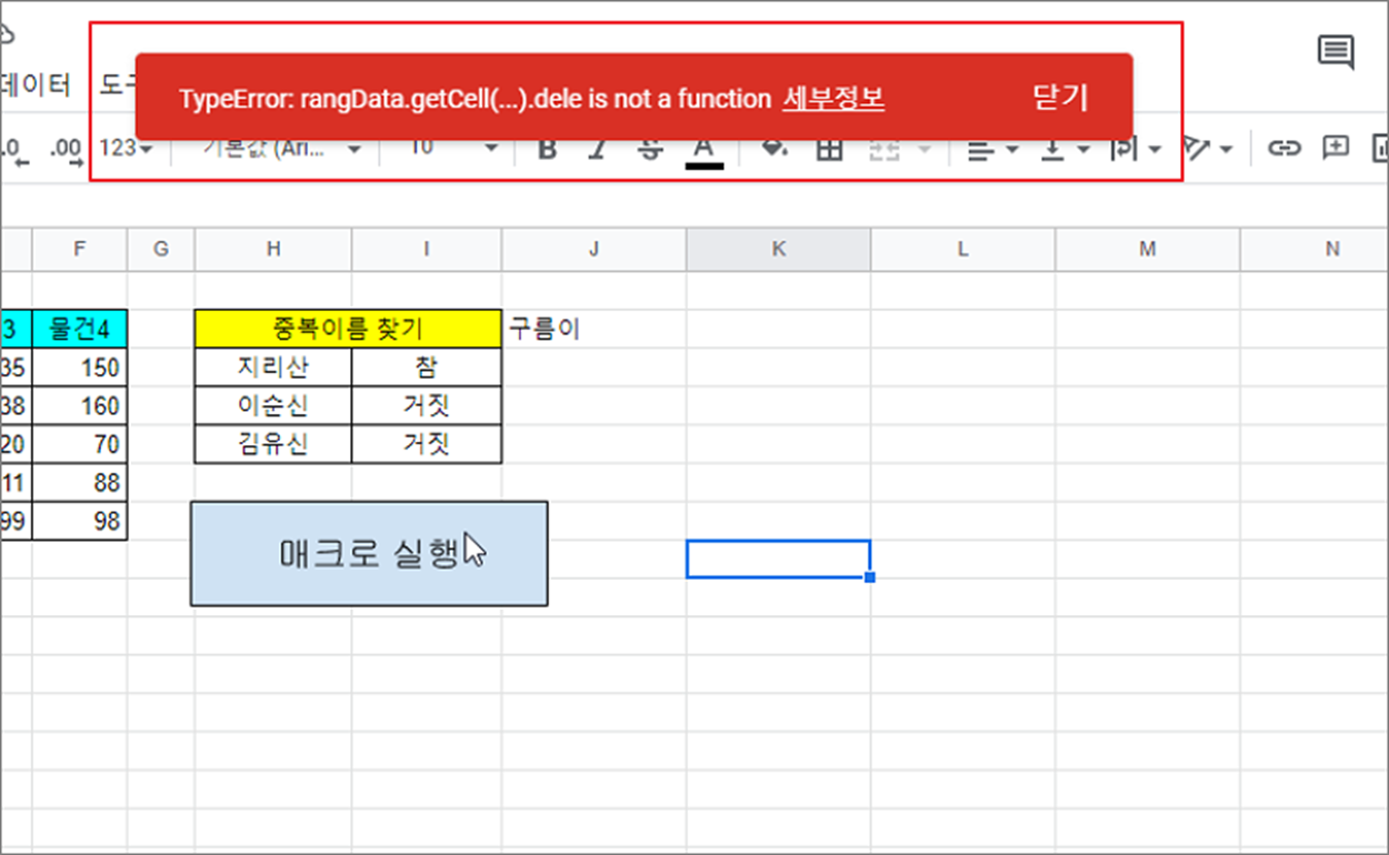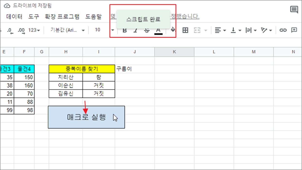 ▼ 스크립트 수정 화면에서 함수의 내용을 수정하고 저장한 후 다시 매크로 버튼을 눌러 테스트해 봅니다.