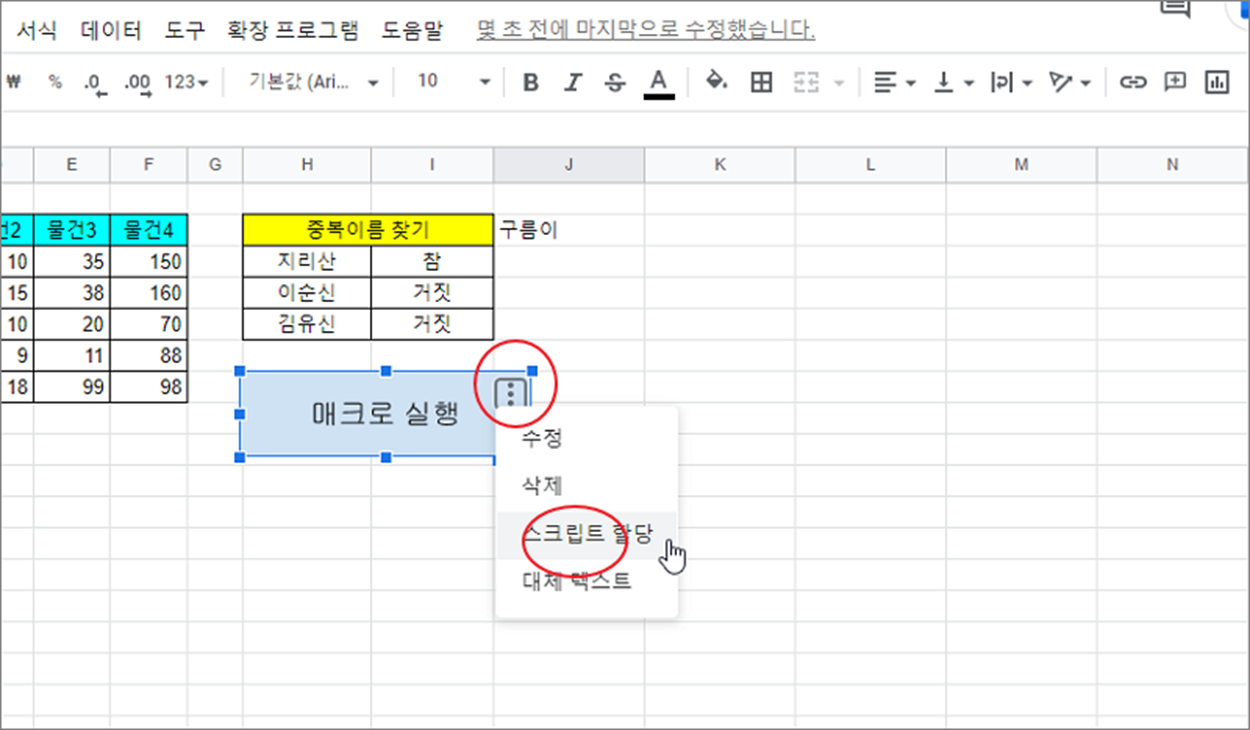 ▼ 다음으로 시트에 추가한 버튼을 클릭했을 때 스크립트가 실행되도록 연결을 시작합니다. 버튼에서 오른쪽 상단 더보기 > 스크립트 할당 메뉴를 클릭합니다.