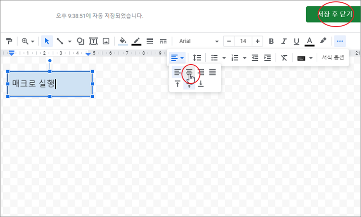 ▼ 버튼에 들어간 텍스트의 정렬을 중앙으로 바꾸고 오른쪽 상단에 저장 후 닫기 버튼을 클릭합니다.