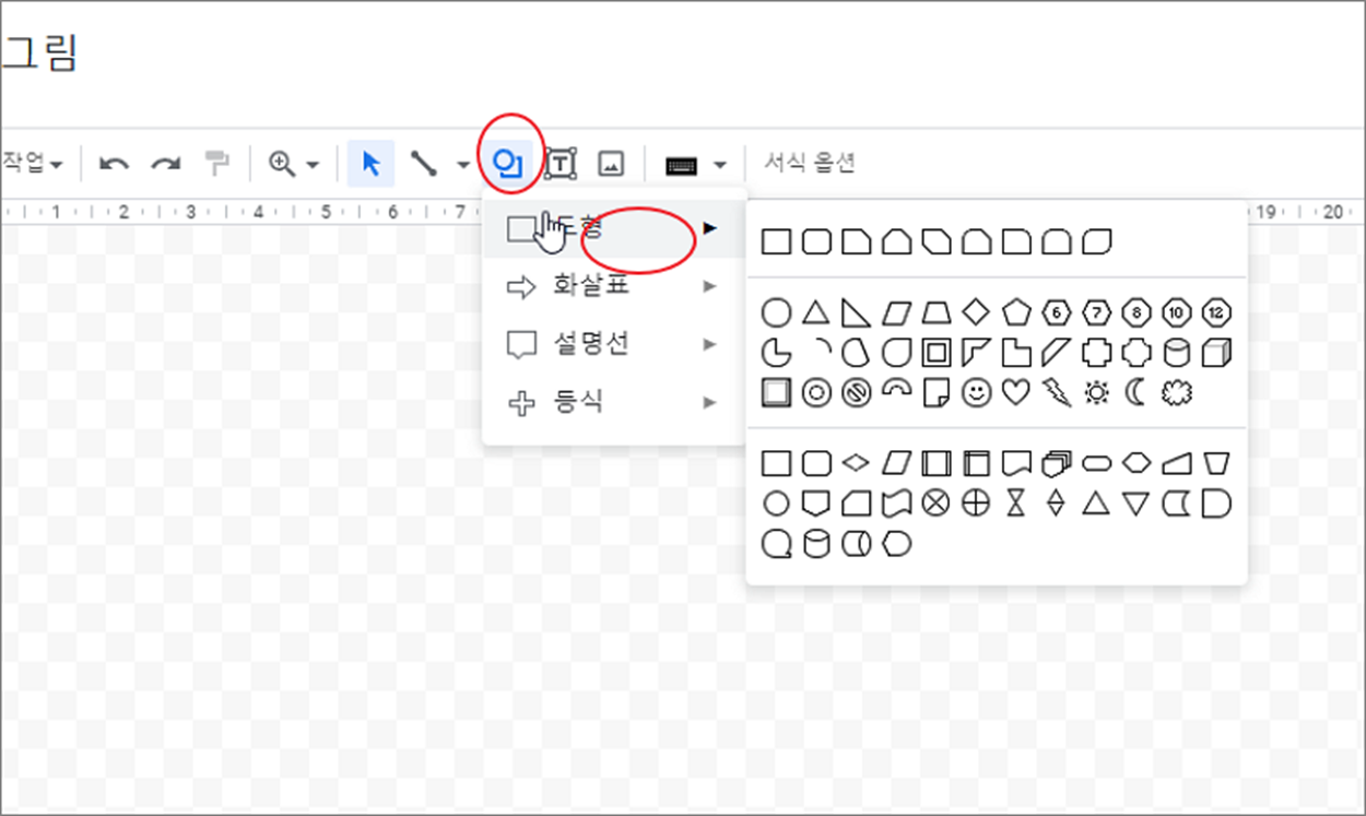 ▼ 스프레드시트에서 제공하는 그림 창은 이미지 캔버스입니다. 여러 도구를 사용해서 캔버스에 그린 이미지를 시트에 추가할 수 있습니다. 버튼도 사각형 도형으로 만들어서 추가하면 됩니다. 상단 도구 모음 리본메뉴에서 도형 > 도형 으로 이동합니다. 그리고 버튼으로 적당한 모양의 모형을 선택하고 캔버스에 추가합니다.
