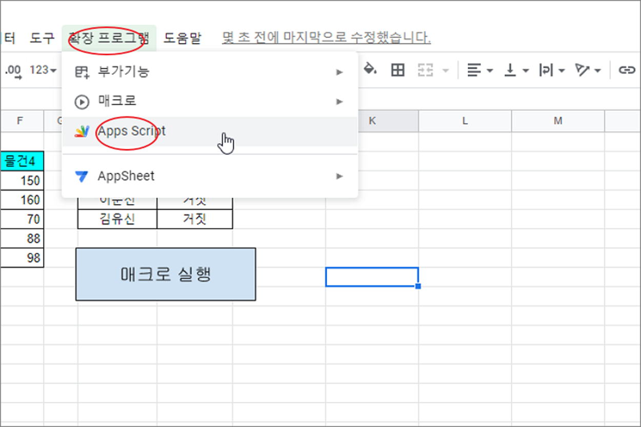 ▼ 오류 메시지를 수정하기 위해 스크립트 편집 화면으로 이동하겠습니다. 확장 프로그램 > Apps Script 메뉴를 클릭합니다.