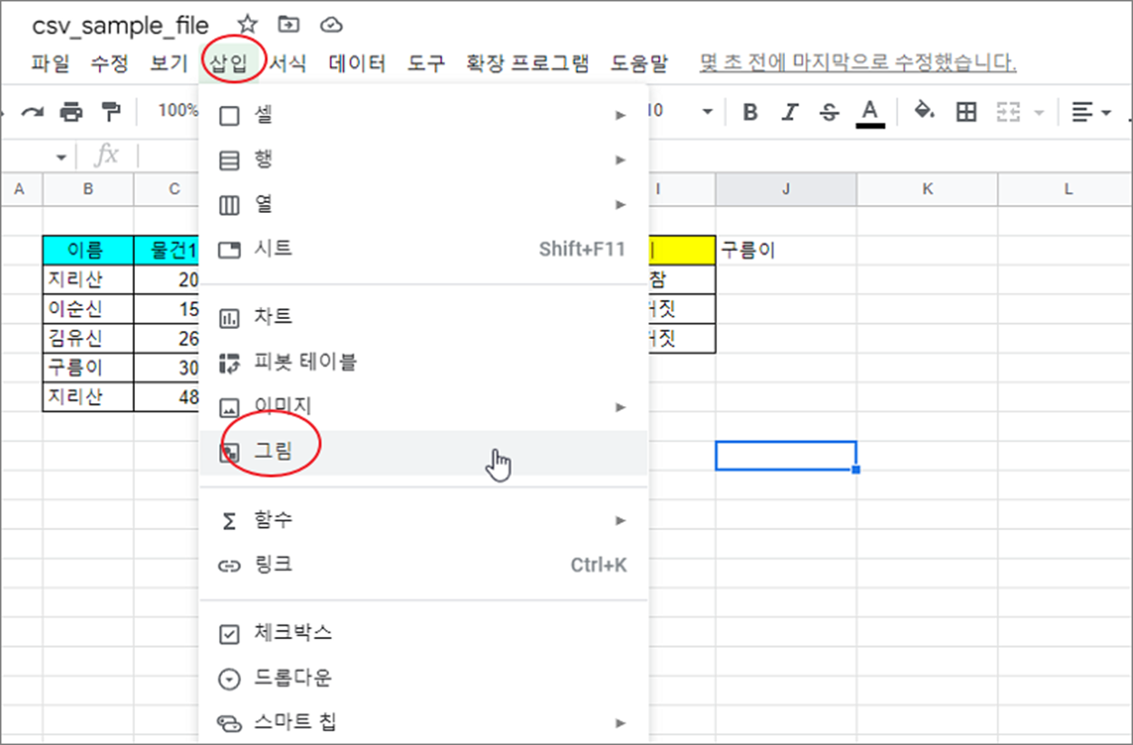 스프레드시트는 엑셀과 달리 버튼 컨트롤을 제공하지 않습니다. 사용자가 직접 도형을 그려서 버튼을 만들고 작성한 스크립트를 연결해야 합니다. 시트에 추가한 버튼을 클릭해서 매크로 함수를 실행하는 방법에 대해 알아보겠습니다.