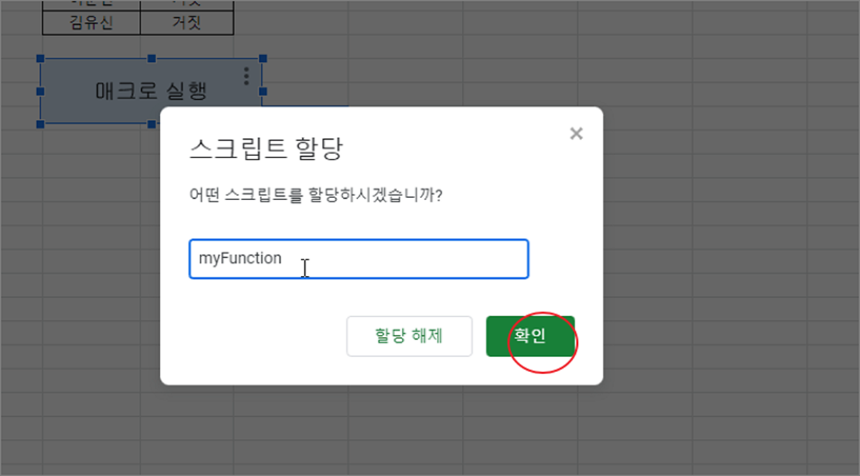 ▼ 스크립트 할당 창이 뜨면 실행할 스크립트 함수명을 입력합니다. 함수명은 대소문자 구분해서 정확하게 입력합니다. 그리고 확인 버튼을 눌러 창을 닫습니다.