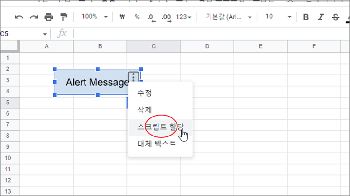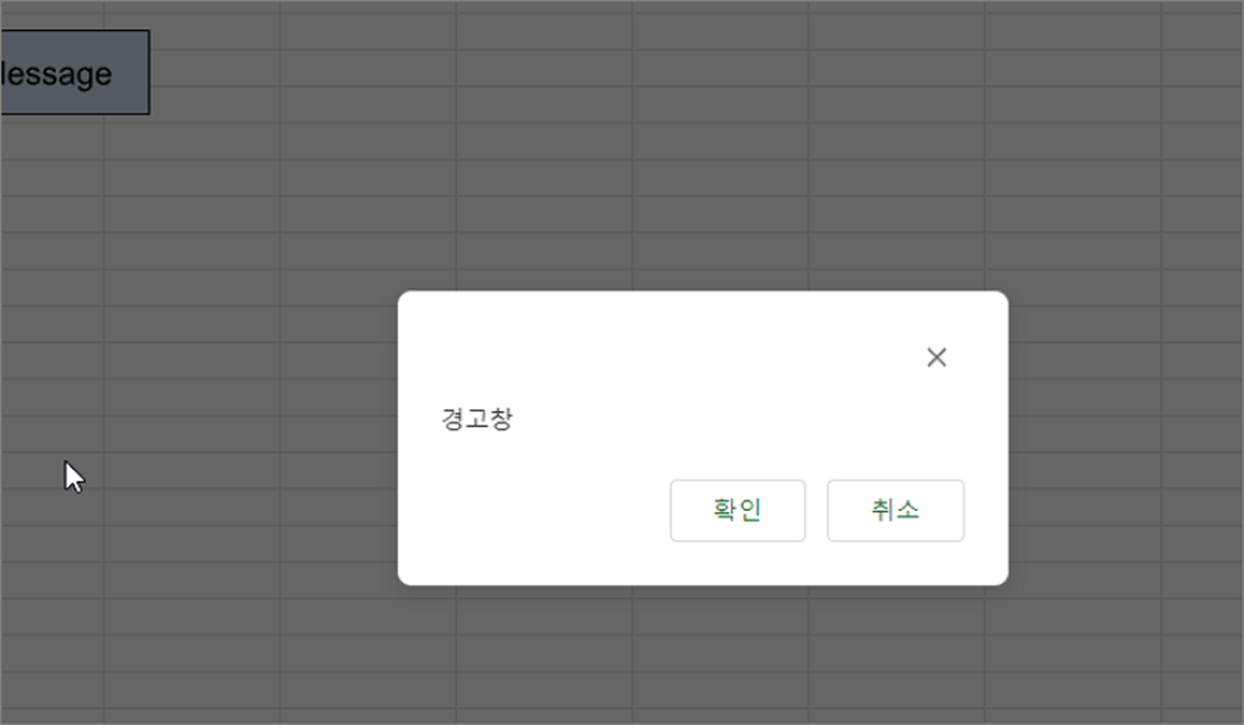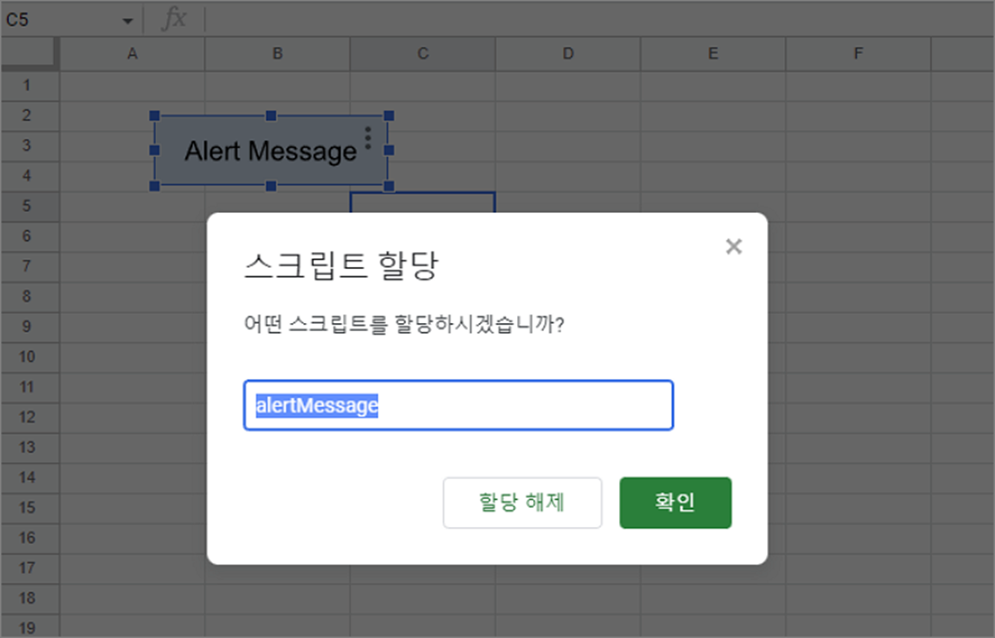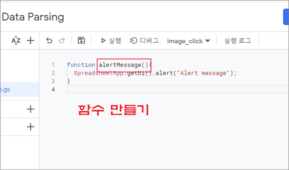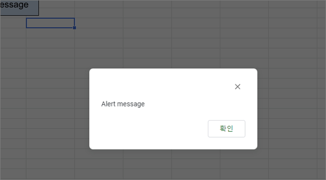 ▼ 스프레드시트에 만든 버튼과 알림창 소스가 들어간 스크립트 함수를 연결해서 화면에 띄워보겠습니다. 아래와 같이 버튼과 연결할 함수를 만듭니다. 알림창을 띄우는 함수는 alert() 입니다. 표시할 메시지를 함수 파라미터로 입력합니다.