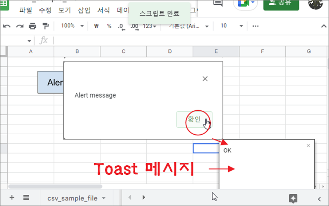 스프레드시트는 엑셀과 달리 버튼 컨트롤을 제공하지 않습니다. 사용자가 직접 도형을 그려서 버튼을 만들고 작성한 스크립트를 연결해야 합니다. 시트에 추가한 버튼을 클릭해서 매크로 함수