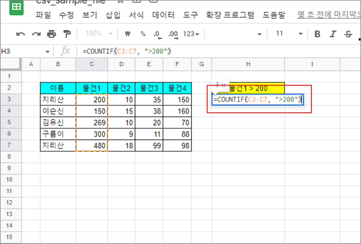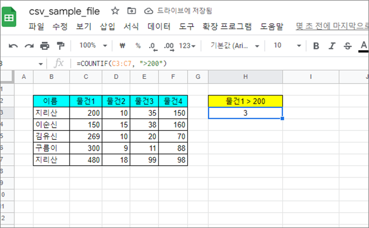 ▼ 조건을 넣어서 숫자를 센 결과는 다음과 같습니다. 200 보다 큰 셀 값이 3개로 나왔습니다.