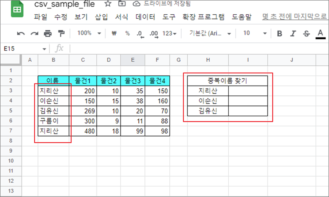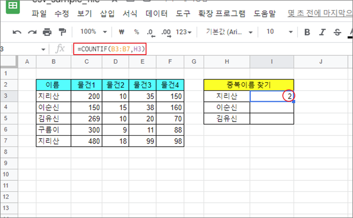▼ 먼저 간단한 샘플로 동일한 텍스트가 들어간 셀의 개수를 세어 보겠습니다. “이름” 열에 두 번 이상 동일한 이름이 들어갔는지 체크할 것입니다.