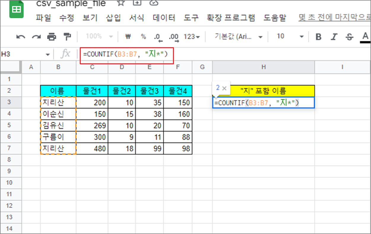 아래 수식에서는 지정한 영역에 “지” 로 시작하는 모든 이름을 찾아 개수를 셉니다.