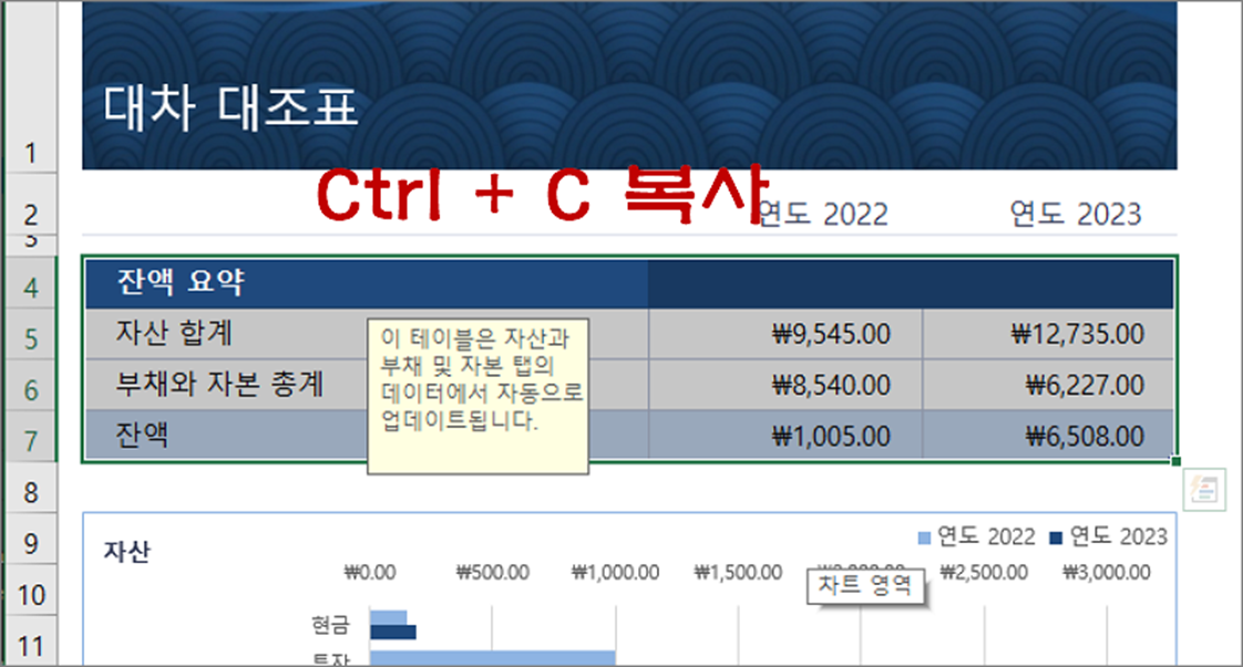 ▼ 엑셀 전체가 아닌 특정 영역을 복사해서 이미지로 저장해 보겠습니다. 이미지로 저장하고 싶은 영역을 드래그해서 단축키 Ctrl + C 를 눌러 클립보드에 복사합니다.