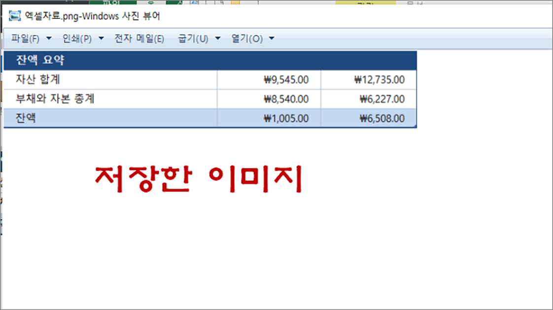 ▼ PNG 이미지로 저장하고 뷰어로 띄운 결과입니다. 이런 식으로 엑셀에서 특정 영역을 이미지로 변환한 후 저장해서 상대방에게 전달할 수 있습니다.