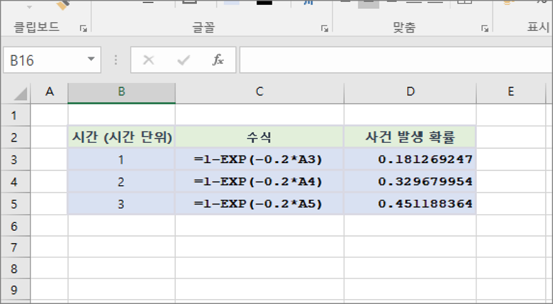 분포에서 특정 시간 내에 사건이 발생할 확률은 'EXP' 함수를 사용하여 계산할 수 있습니다. 아래 표는 시간 내에 사건 발생 확률을 보여줍니다.