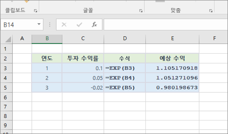 투자 수익률을 계산할 때 'EXP' 함수를 사용하여 예상 수익을 모델링할 수 있습니다. 아래 표는 연간 투자 수익률을 보여줍니다.