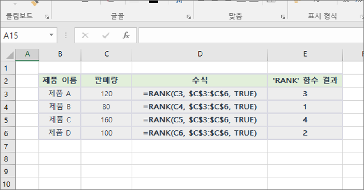 ▼ 이 예제에서는 제품들의 판매량을 비교하여 'RANK' 함수를 사용하여 제품들의 판매량 랭킹을 계산합니다. 높은 판매량 순서대로 순위를 매기기 위해 'RANK' 함수에 `TRUE`를 사용하여 오름차순으로 순위를 계산합니다.