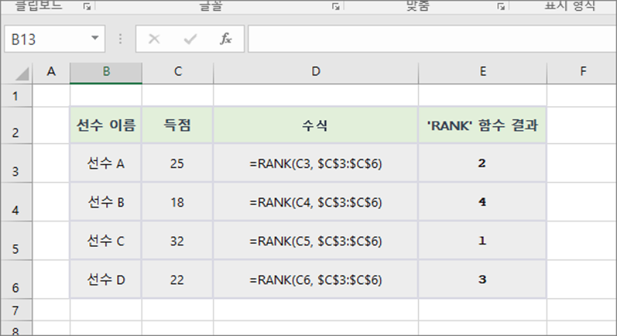 ▼ 이 예제에서는 선수들의 경기 득점을 비교하여 'RANK' 함수를 사용하여 선수들의 경기 결과 예측 랭킹을 계산합니다. 득점이 높은 순서대로 순위를 매기기 위해 'RANK' 함수를 사용합니다.