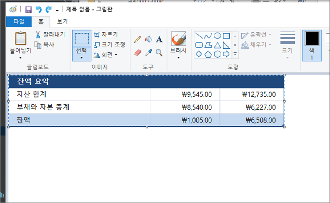 ▼ 이렇게 클립보드에 복사한 엑셀 영역을 그림판으로 옮기겠습니다. 그림판 실행해서 Ctrl + V 를 눌러 붙여 넣습니다.