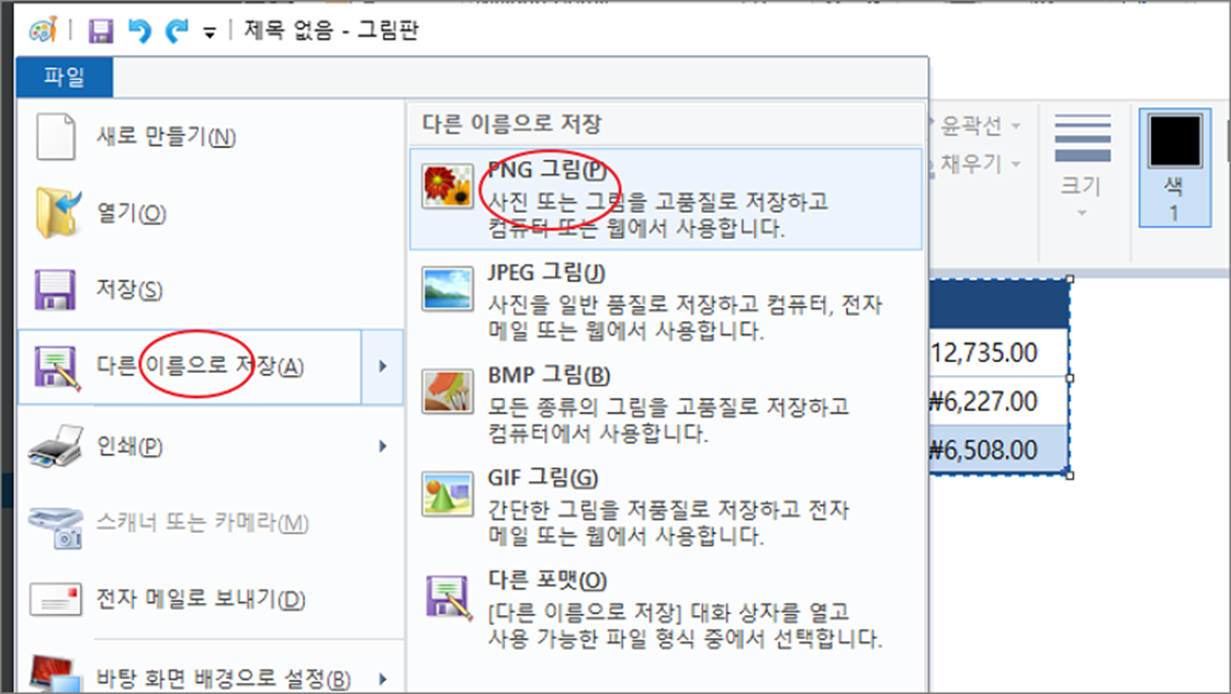 ▼ 이제 그림판에서 완성한 엑셀 영역을 이미지로 전환해 보겠습니다. 그림판에서 파일 > 다른 이름으로 저장 > PNG 그림 메뉴를 클릭합니다. 그 외 다른 이미지 확장자로 저장할 수도 있습니다.