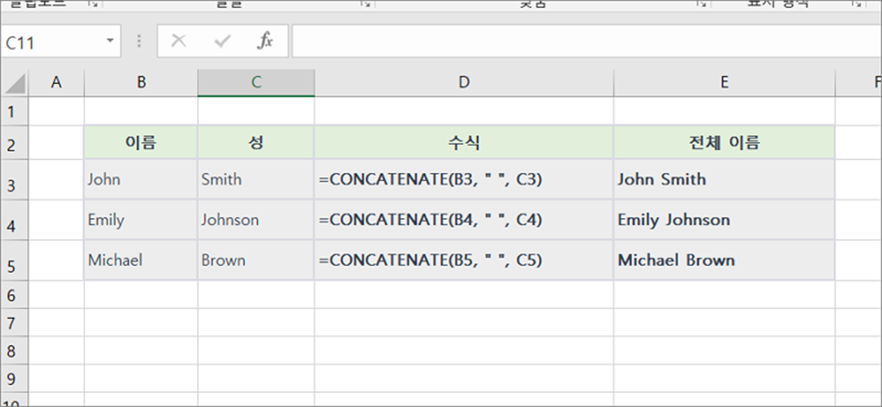아래 예제에서는 이름과 성을 각각 입력하고 'CONCATENATE' 함수를 사용하여 이름과 성을 공백으로 구분하여 전체 이름을 생성합니다.