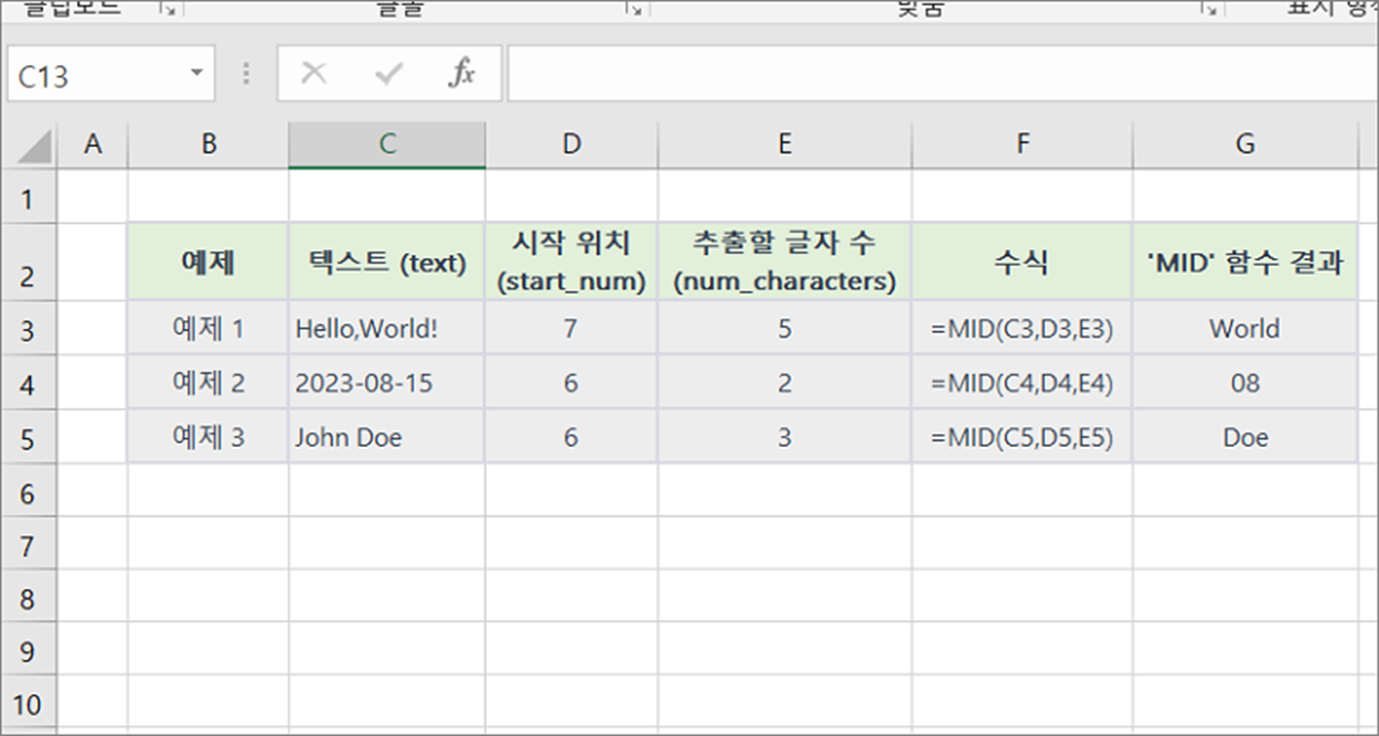 아래에 'MID' 함수의 실제 사용 예제 3개를 보여 드리겠습니다.