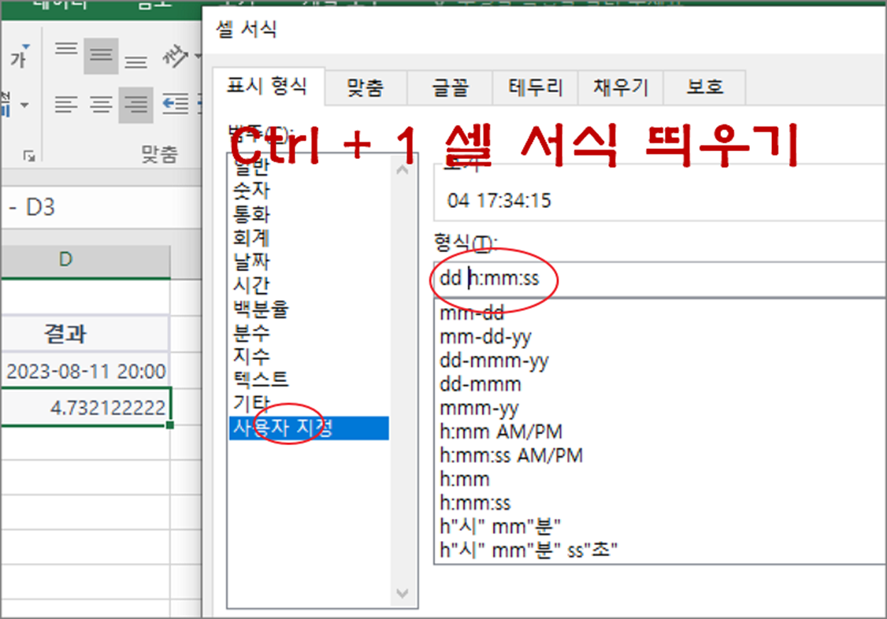 ▼ 정확한 시간 계산을 위해서 Ctrl + 1을 눌러 셀 서식을 변경하겠습니다. 표시 형식 > 사용자 지정 > 형식 항목에 ‘일’ 을 나타내는 ‘dd’ 와 시간, 분, 초를 가리키는 h:mm:ss 을 조합합니다.