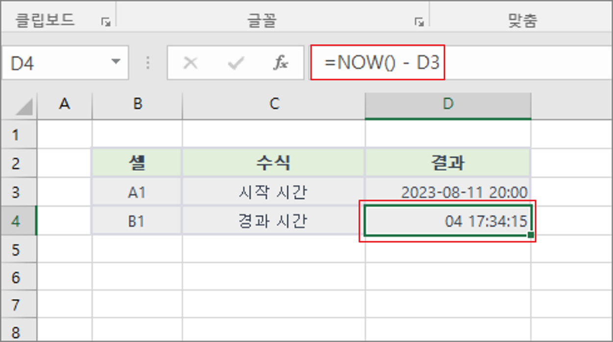 ▼ 결과값은 다음과 같습니다. 지정한 시작 시간과 현재 시간을 빼서 경과한 날과 시간을 추출했습니다.