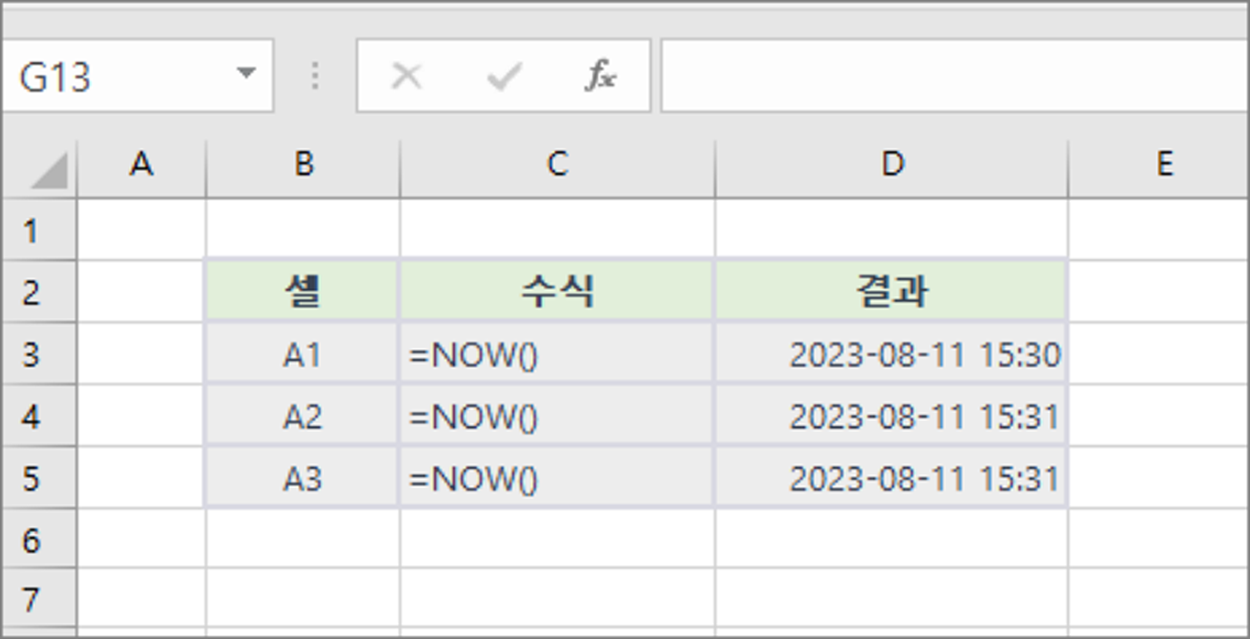 ▼ 예제에서는 'NOW' 함수를 사용하여 현재 날짜와 시간을 각각의 셀에 자동으로 기록합니다. 셀 A1에 'NOW' 함수를 입력하면 해당 셀에는 현재 시간인 2023년 8월 11일 15시 30분 45초가 표시됩니다. 이후에도 다른 셀에 같은 수식을 사용하여 실시간으로 시간이 갱신합니다. NOW 데이터베이스나 로그에 이벤트의 발생 시간을 기록할 때 유용합니다.