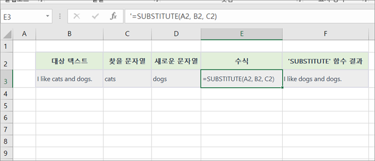 | SUBSTITUTE(대상_텍스트, 찾을_문자열, 새로운_문자열, [바꿀_횟수]) l `대상_텍스트`: 대체를 수행할 텍스트 또는 문자열입니다. l `찾을_문자열`: 대체할 대상 문자나 문자열입니다. l `새로운_문자열`: 대체할 새로운 문자나 문자열입니다. l `바꿀_횟수` (선택 사항): 지정한 횟수만큼 대체를 수행합니다. |