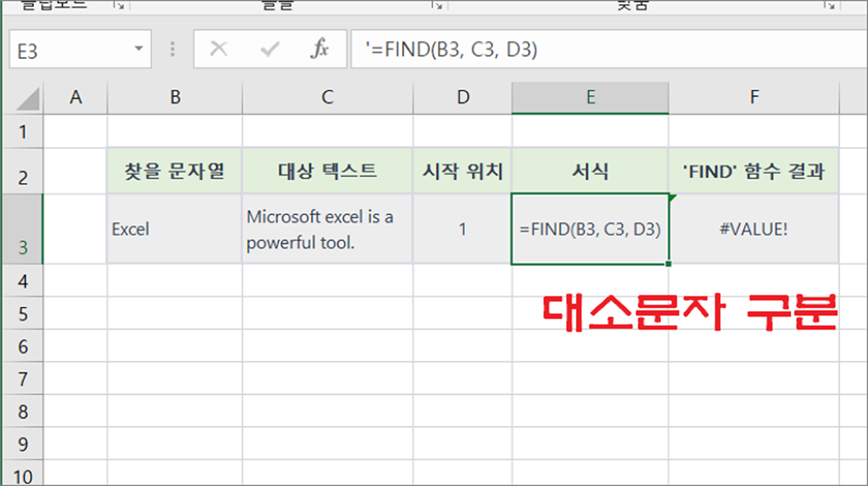 ▼ 대소문자를 구분하기 때문에 대상 텍스트에 ‘Excel’ 해당 문자를 찾지 못한 경우 #VALUE! 에러가 발생합니다.