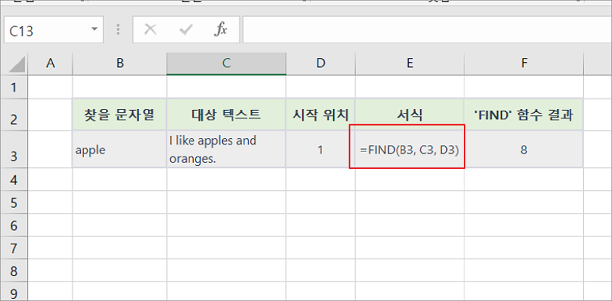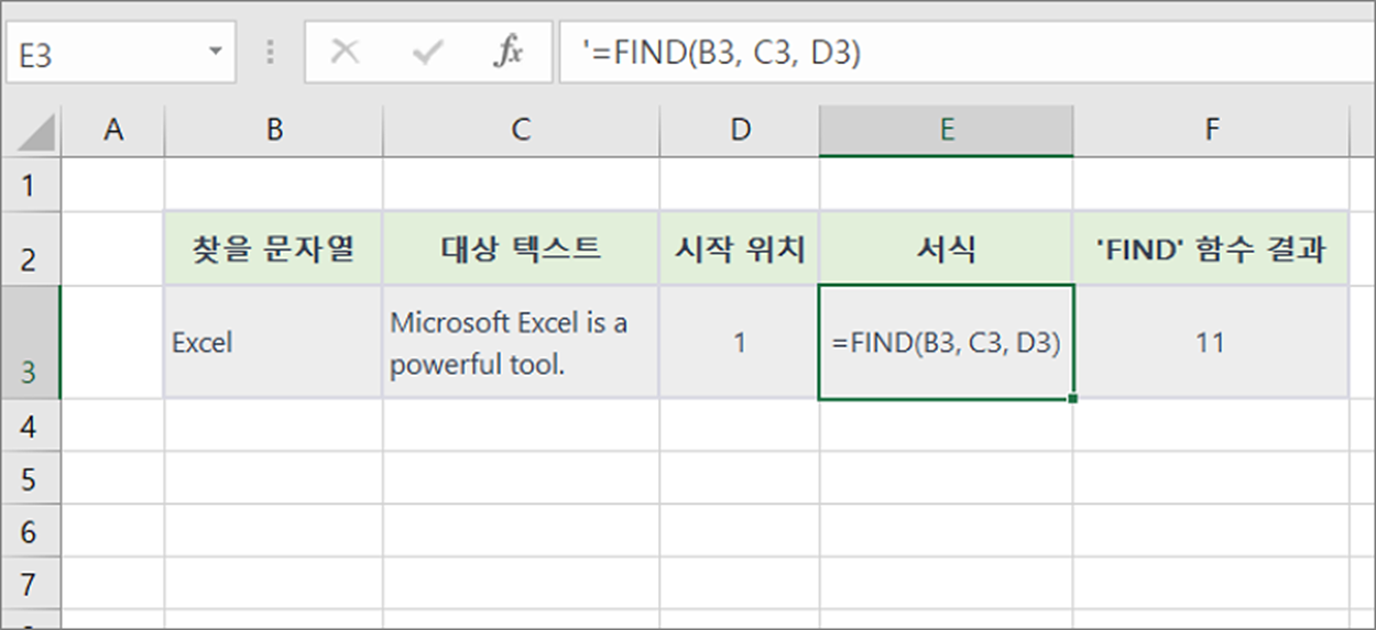 | FIND(찾을_문자열, 대상_텍스트, [시작_위치]) l `찾을_문자열`: 대상 텍스트에서 찾을 문자열이나 검색할 단어입니다. l `대상_텍스트`: 검색을 수행할 텍스트 또는 문자열입니다. l `시작_위치` (선택 사항): 검색을 시작할 위치를 나타내는 숫자입니다. |